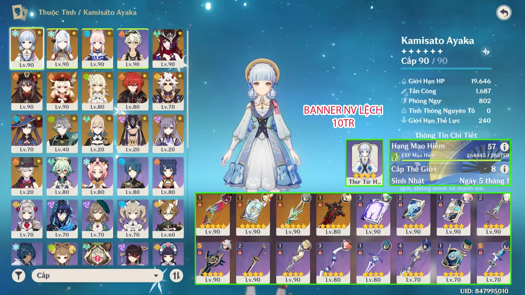 #356045 500,000 500,000 AR level 57 Khu Vực asia Tướng 5* 14 AYAKA SKIN(BANNER NV LỆCH 10TR) Tướng: 14 Vũ khí: 4 Chi tiết