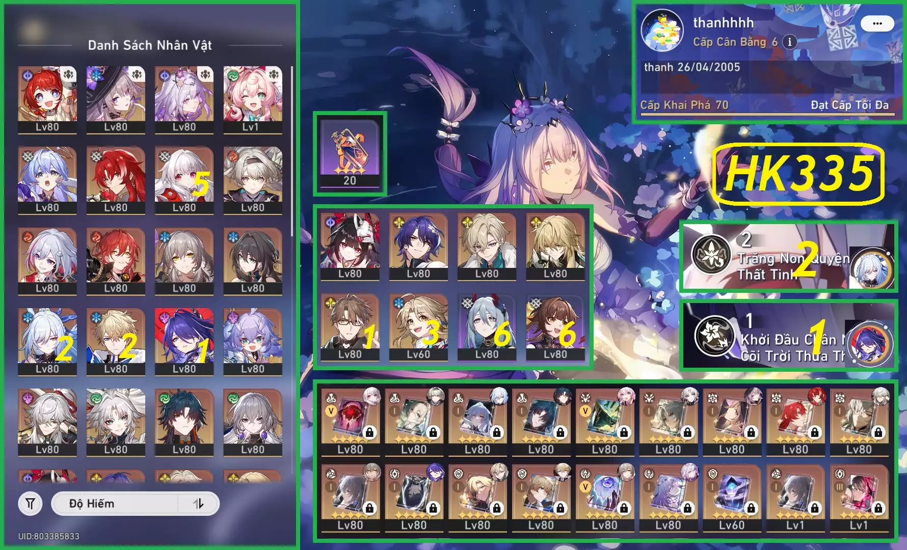 #82173 1,000,000 AR level 70 Khu Vực asia Tướng 5* 18 Combo Hot Tri kẹp Cas Trấn - Đóm Trấn - Jingliu E2 Trấn - Blade Trấn - Feixiao Trấn - Herta Trấn - Argenti Trấn - Jing Yuan Trấn - Acheron E1 Trấn - Aven Trấn Tướng: 18 Vũ khí: 10 Chi tiết