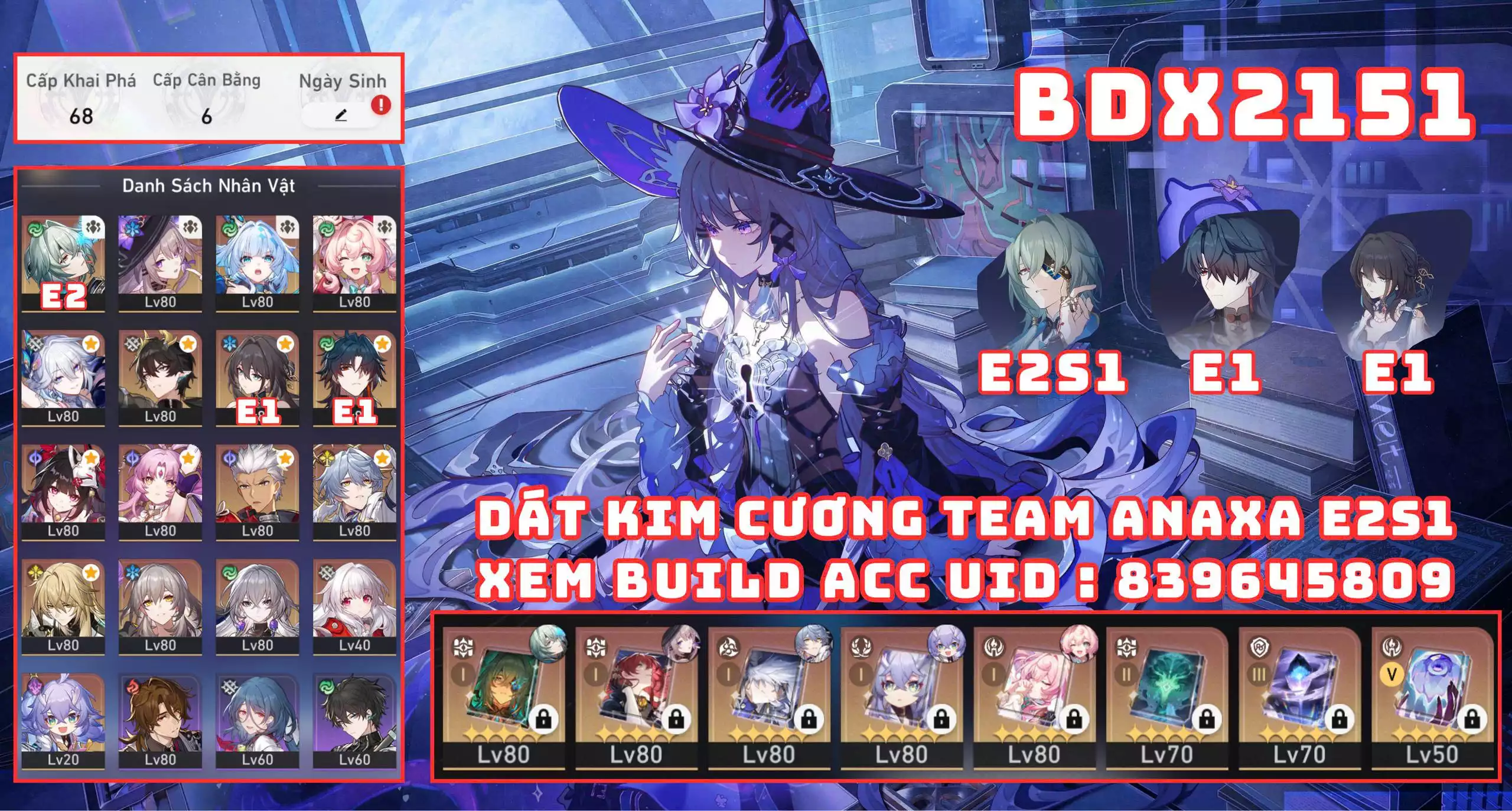 #89121 300,000 AR level 68 Khu Vực asia Tướng 5* 13 BDX2151 - DÁT KIM CƯƠNG TEAM ANAXA E2S1 CỰC HIẾM Tướng: 13 Vũ khí: 3 Chi tiết