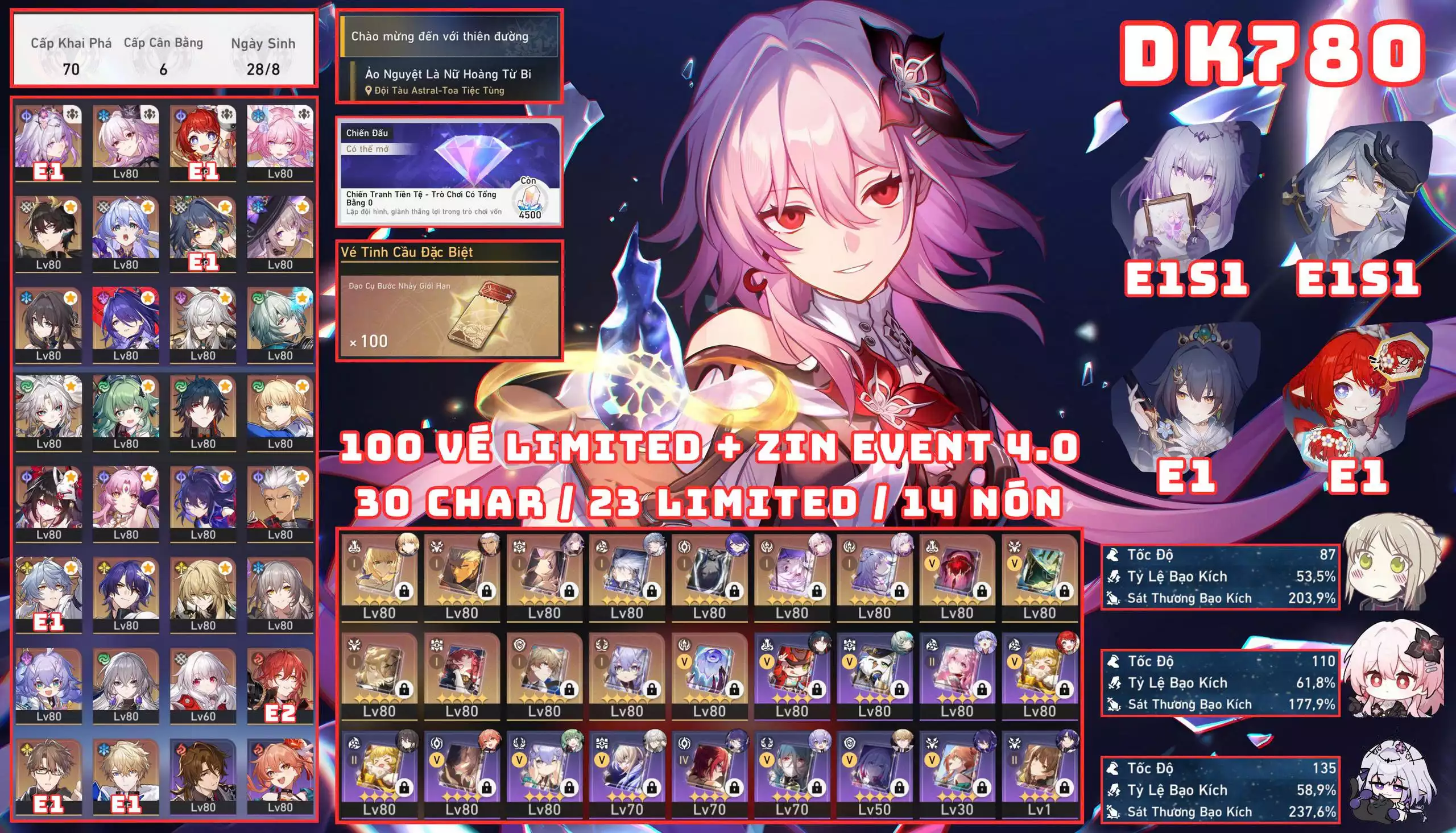 #89133 1,000,000 AR level 70 Khu Vực asia Tướng 5* 23 DK780 - 100 VÉ LIMITED + ZIN EVENT 4.0 / ACC NHIỀU CHAR ĐA DẠNG CHO AE Tướng: 23 Vũ khí: 7 Chi tiết