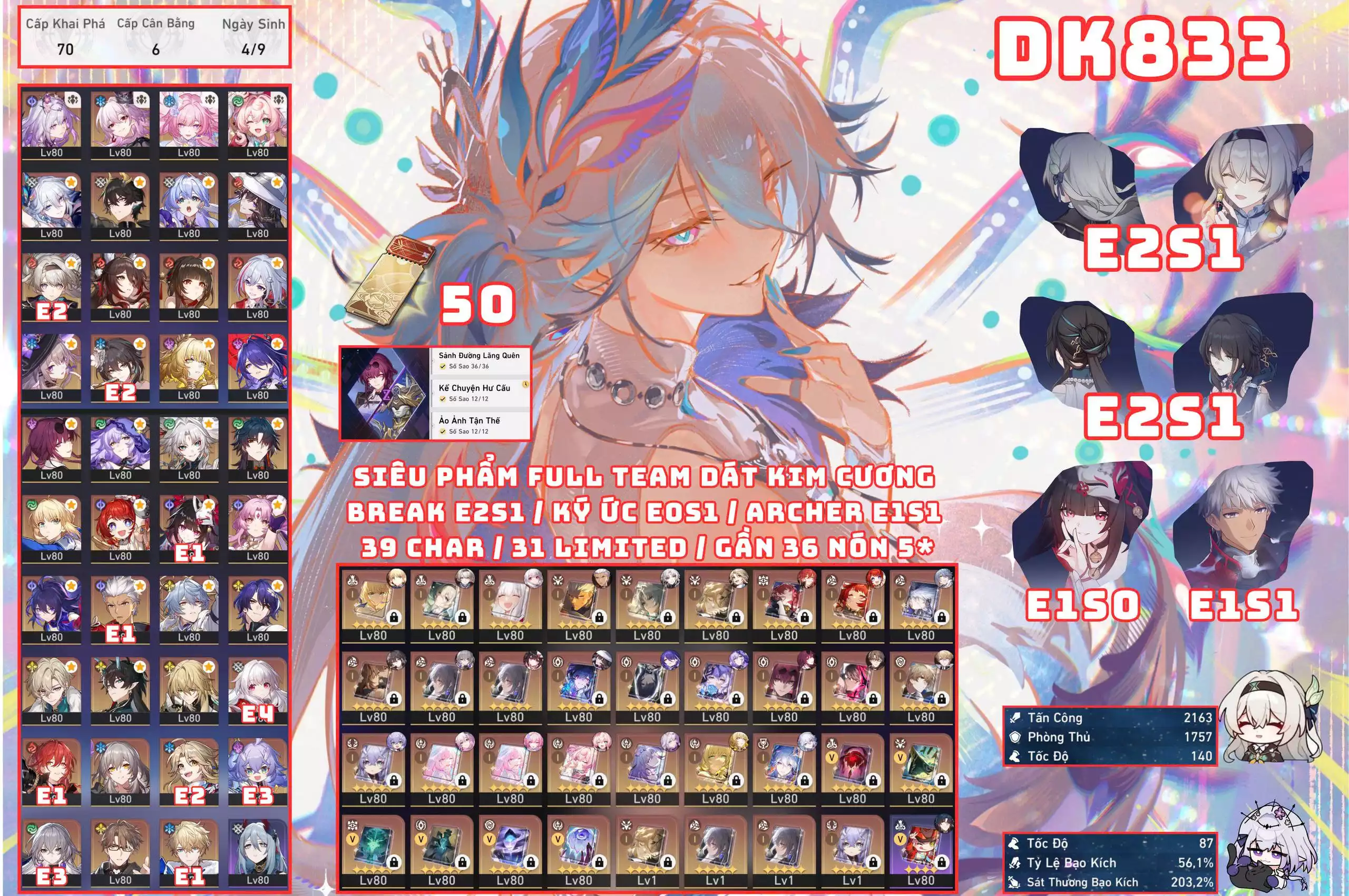 #89135 3,000,000 AR level 70 Khu Vực asia Tướng 5* 31 DK833 - SIÊU PHẨM DÁT KIM CƯƠNG NHIỀU TEAM META / 50 VÉ LIMITED Tướng: 31 Vũ khí: 16 Chi tiết