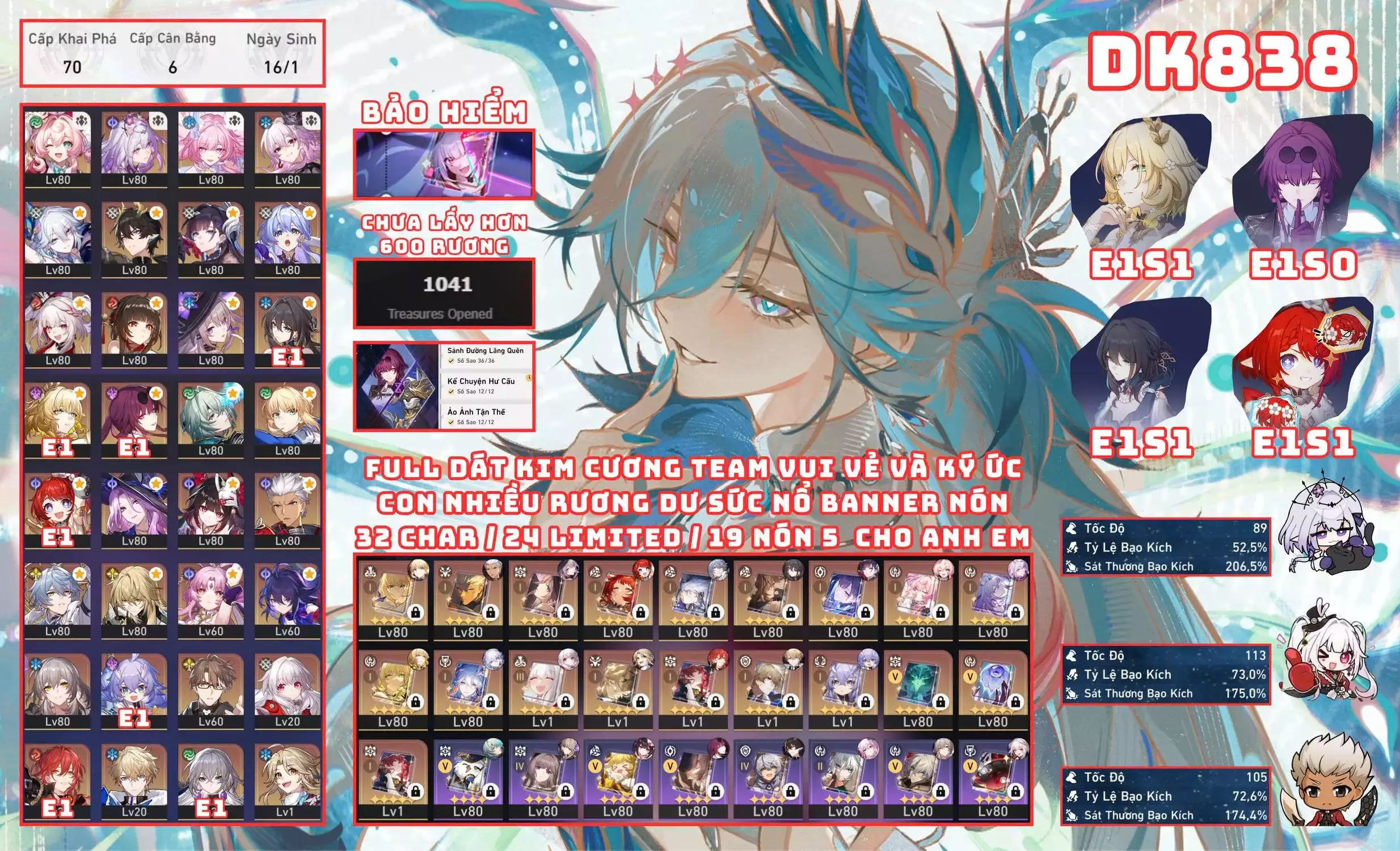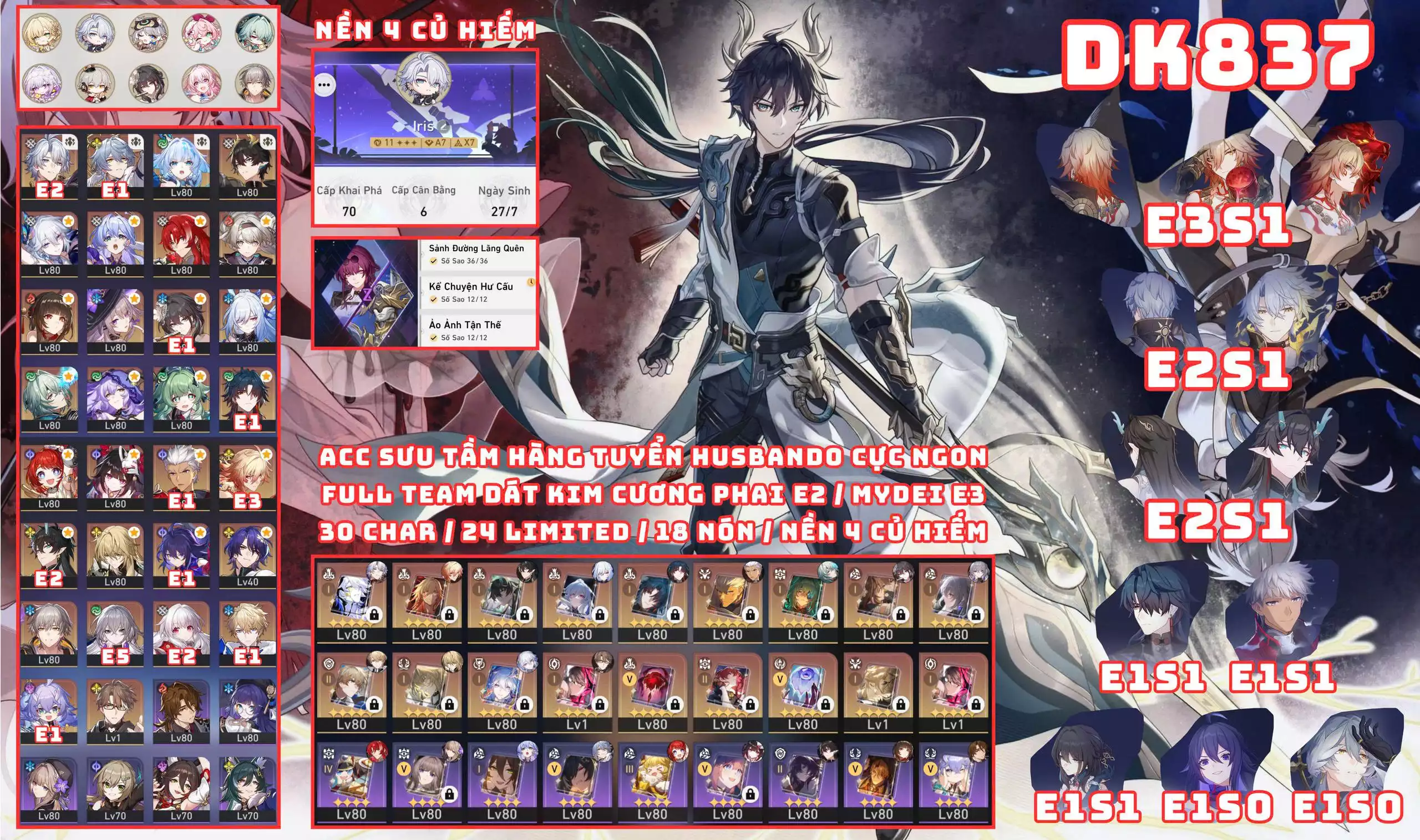 #89169 1,500,000 AR level 70 Khu Vực asia Tướng 5* 25 DK837 - NỀN 4 CỦ HIẾM / DÀN HUSBANDO TINH HỒN CỰC NGON Tướng: 25 Vũ khí: 9 Chi tiết